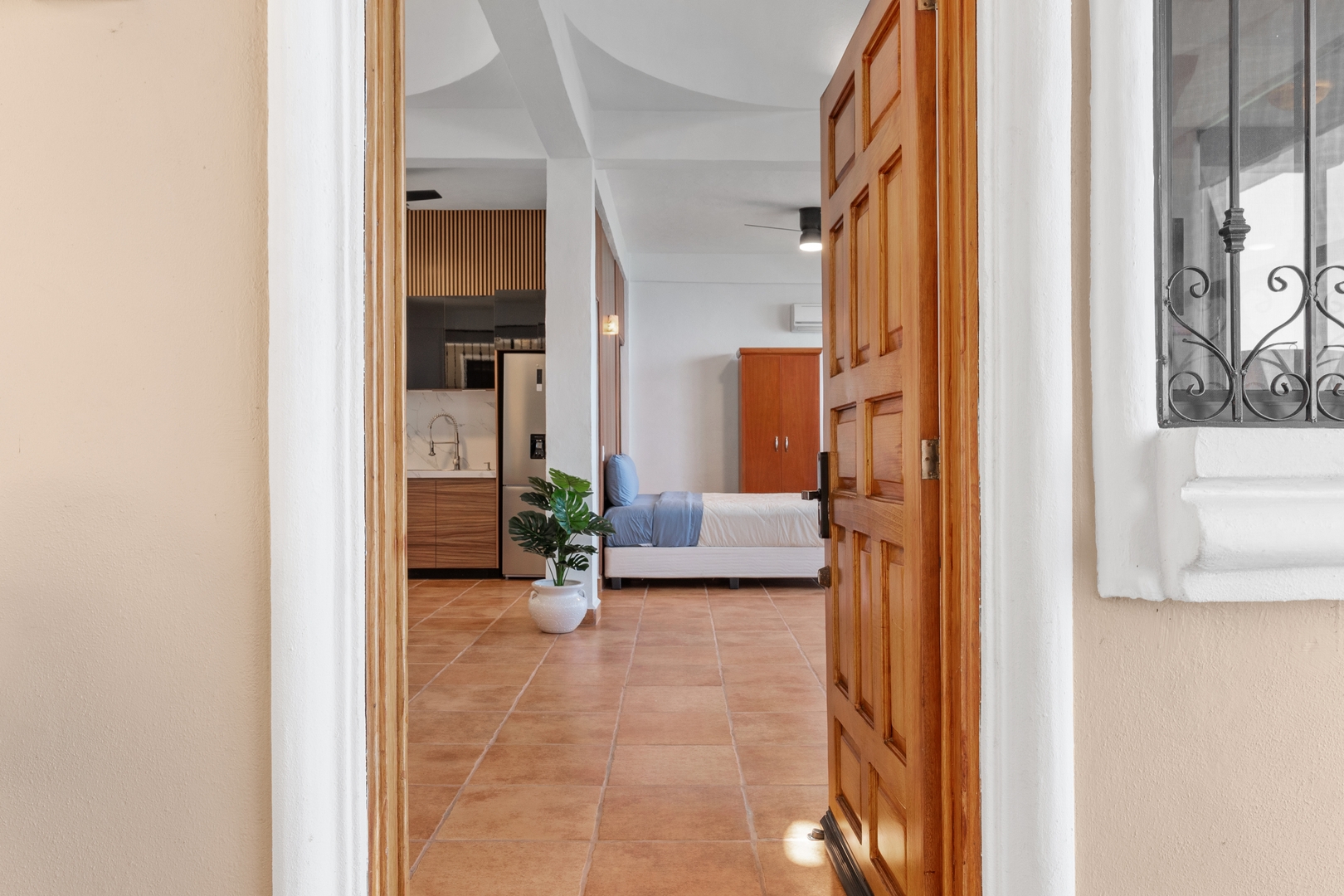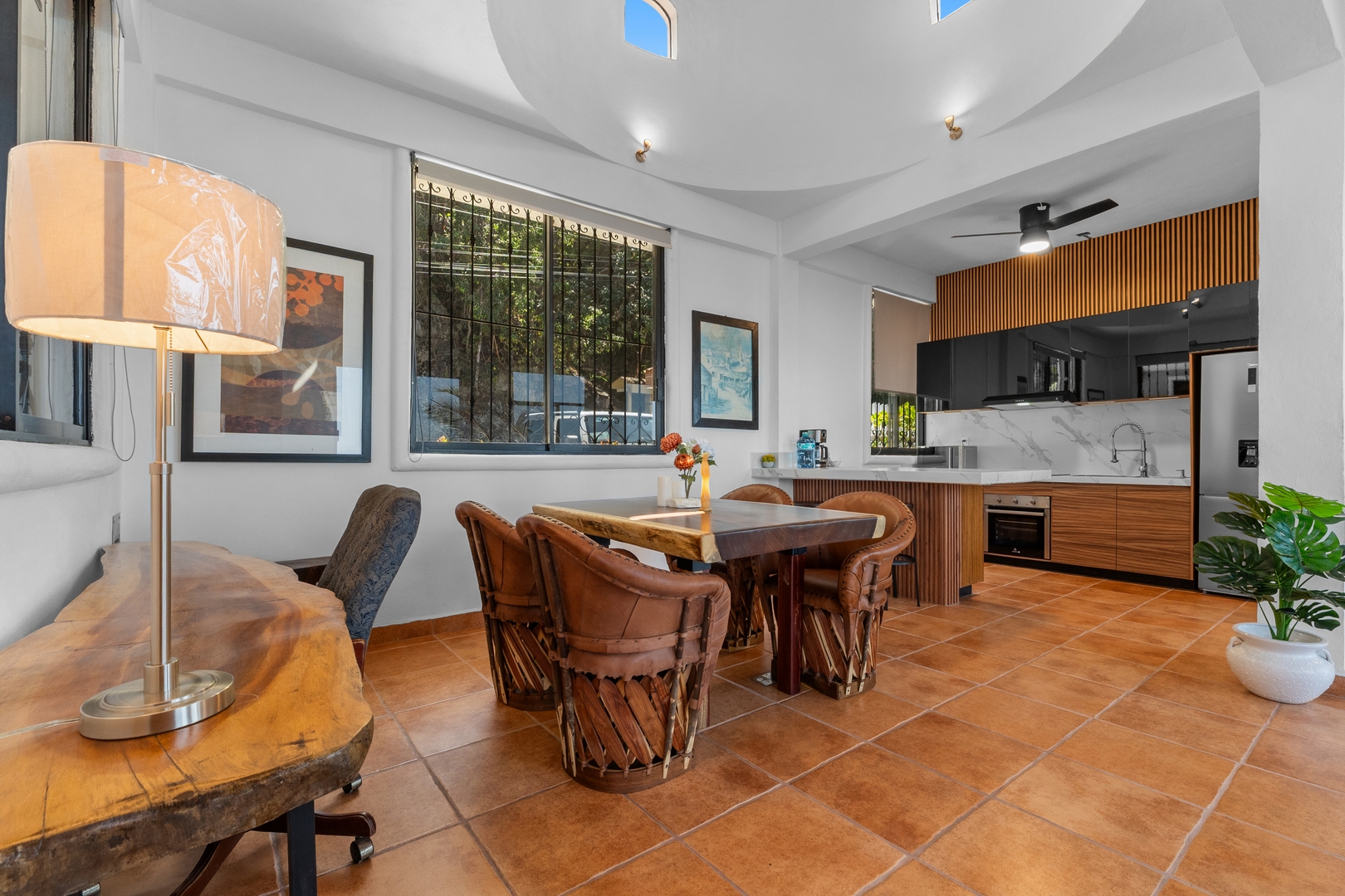 This open-concept Puerto Vallarta apartment features a vibrant Mexican aesthetic with terracotta floors, a brick cupola ceiling, and stunning panoramic ocean views. The layout seamlessly integrates living and sleeping areas with a kitchen equipped with basic appliances. For maximum comfort, the unit includes AC. The charming bathroom offers a vessel sink and an inviting bathtub. This space perfectly blends traditional craftsmanship with modern essentials and a breathtaking coastal backdrop.